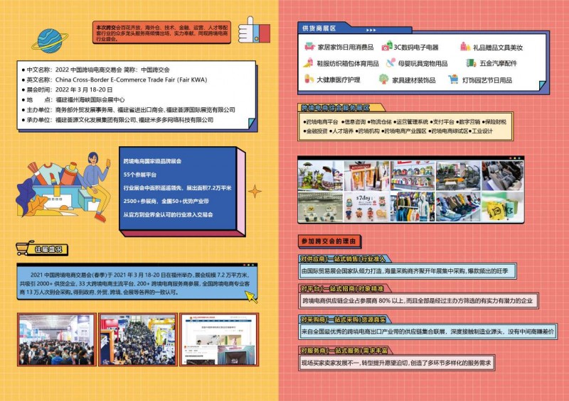2022跨交会于2021年3月18—20日在福州成功举办,展会规模7.2万平方米,来自全国22个省市的2363家企业参展,汇集了长三角、珠三角、京津冀和福建等35个全国出口型产业带及其品牌企业,吸引了200多家实力服务商,覆盖全球33个跨境电商平台,涵盖跨境电商各环节,累计成交超过35亿美元,专业采购商到会超过13万人次,受到业界广泛关注与一致好评。在此基础上,2022年跨交会将整合已有资源,持续丰富跨境电商供货产业带,优化展区展品,加大跨境卖家采购商邀约力度,升级高端论坛与活动,打造中国跨境电商行业龙头盛会。