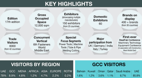 STEEL FAB是中东较大的金属加工、焊接切割及钢铁制造装配行业的博览会。自2004年首届成功举办以来,参展商数量、展位面积、展品种类逐年高速增长。STEELFAB这个品牌也逐步受到全球金属加工及钢铁行业业界人士的高度关注,并被认为是进入高速发展的中东、中亚及北非市场的渠道和平台。STEELFAB迎合了整个金属加工及钢铁行业对数控机床、焊接设备、管材加工设备、预处理设备、后期处理设备、辅助设备、外处理设备的供应需求。2019年该展展览净面积11000多平方米,吸引了来自21个国家的252家参展商,以及专业观众6838人次。参展商来自澳大利亚、奥地利、巴林、比利时、巴西、保加利亚、加拿大、中国、克罗地亚、捷克、丹麦、芬兰、法国、德国、希腊、荷兰、香港、印度、伊朗、意大利、日本、约旦、韩国、马来西亚、阿曼、波兰、葡萄牙、俄罗斯、沙特阿拉伯、南非、西班牙、瑞典、瑞士、台湾、土耳其、阿联酋、英国和美国。