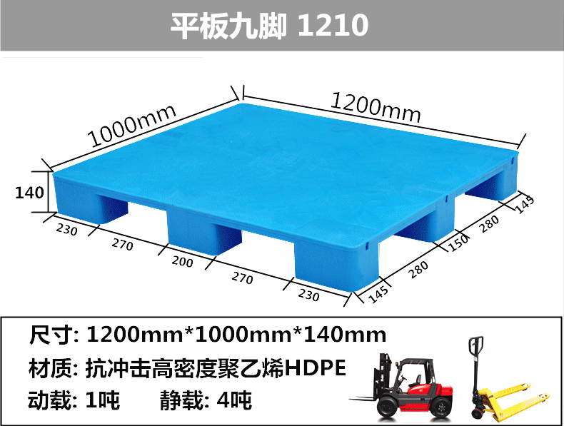 底部为九脚型,因而得名1111九脚平板塑料托盘。此类一般承载都比较轻,不适合于上货架或者转载大重量的货物,九脚托盘一般都作为仓库轻型货物垫仓板,叉车周转较轻货物使用。此类托盘表面形状有:平面与网格之分。