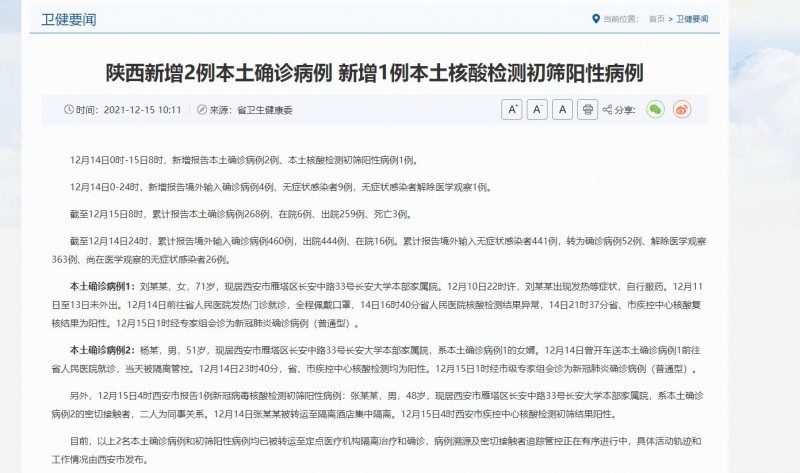 本土确诊病例1:刘某某,女,71岁,现居西安市雁塔区长安中路33号长安大学本部家属院。12月10日22时许,刘某某出现发热等症状,自行服药。12月11日至13日未外出。12月14日前往省人民医院发热门诊就诊,全程佩戴口罩,14日16时40分省人民医院核酸检测结果异常,14日21时37分省、市疾控中心核酸复核结果为阳性。12月15日1时经专家组会诊为新冠肺炎确诊病例(普通型)。