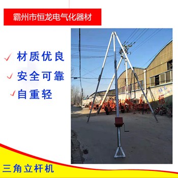 线杆立杆机 三角架立杆机 电力立杆器 铝合金三角立杆机 角立杆机 铝合金三角立杆机 三脚架立杆机 三脚立杆机 立杆器 起杆器 三角拔杆 三角抱杆 三角扒杆 材质为铝镁合金材质,重量轻,强度大,适合山区或者吊车无法进入的地方起吊电线杆。本厂主营产品共有16大类500多种产品。产品有玻璃钢穿孔器、电缆放线车、机动绞磨、铝合金抱杆、电缆剪刀、压接钳、电缆滑轮、收放线车、电缆模块接续机、三角架立杆机、牵引车、电缆放线架、挖坑机、拖拉机绞盘、器材绞盘、运杆车、冲孔机、电缆剥皮刀、脚扣、安全带、绝缘鞋、电工包等产品。1、立杆机杆体采用国标铝合金管,重量轻,承载能力强。3、立杆机采用快、慢双速手摇绞磨,结合双滑轮组,单人即可完成立杆工作。电杆立杆机 三角架立杆机 电力立杆器