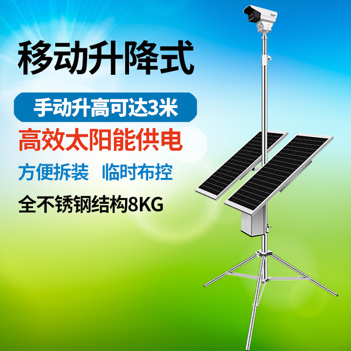 智慧工地可移动式太阳能监控是我公司一款专利产品,专利申请号为:2020303005696_便携式手动升降太阳能监控装置,这是一款直接用太阳能供电,不需市电的移动式太阳能监控,重量只有10KG,非常方便移动式临时布控,适用于:智慧工地(可语音对讲,检测人员是否配带安全帽等行为),运动会人员聚集布控,垃圾站环境检测等。1,太阳能发电