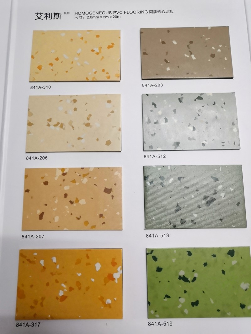 材料类型:同质透心卷材 材质:聚氯乙烯树脂 涂层:UV 防火等级:B1 防滑性能:R9 动态摩擦系数:DS 卷宽:2m 卷长:20m 总厚度:2.0mm 重量:2900g/㎡ 尺寸稳定性:≤0.4% 色牢度:≥6 抗污性能:无污染 弯曲性:无开裂 抗菌:合格 抗碘状:优 附加特性:轮椅滚动,静电负荷,基层遇热,抗酸碱能力