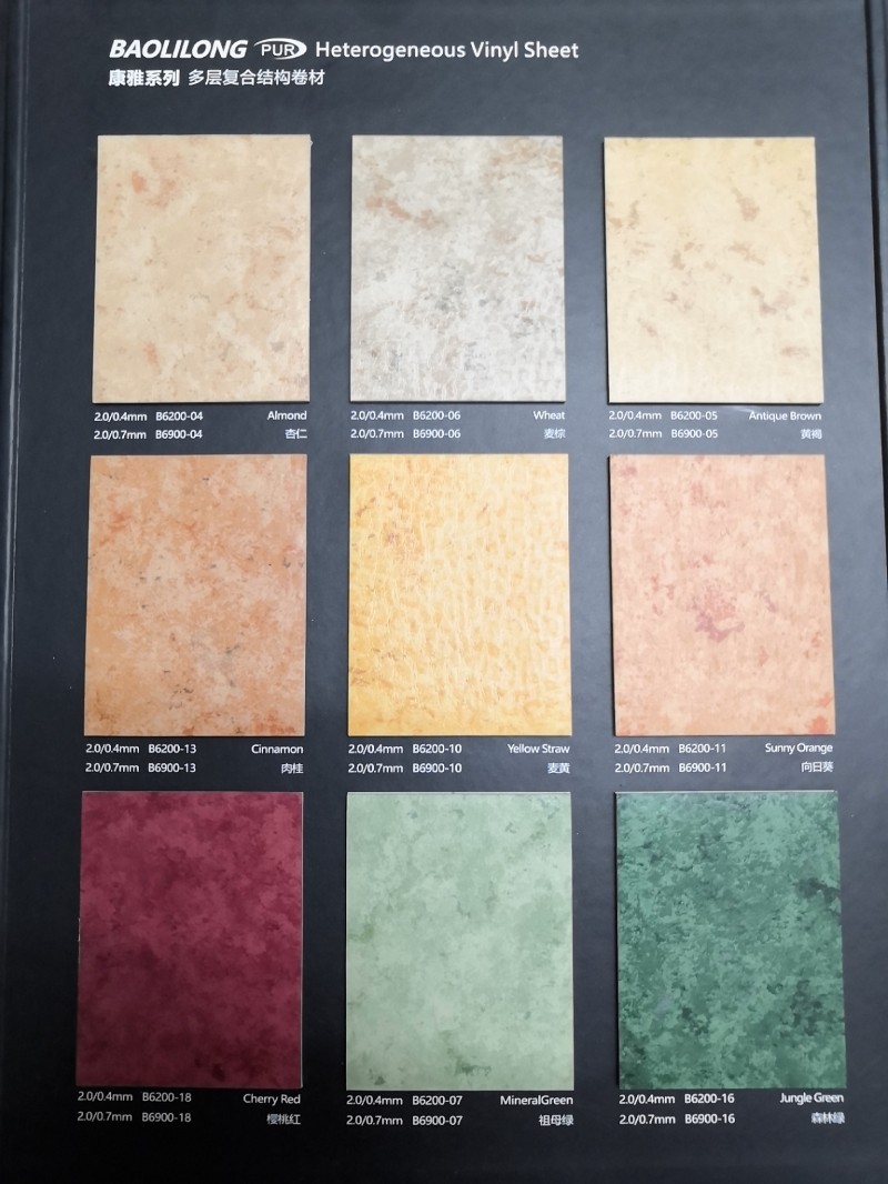 材料类型:带聚氨酯涂层的多层复合结构卷材 图案:大理石 尺寸:2.0×(20/15)m 总厚度:2.0mm 耐磨层厚度:0.4/0.7mm 残留凹陷度:≤0.1 尺寸稳定性:≤0.40% 色牢度:≥6 耐磨度:T 防火:Bf1-S1/B1 防滑:R9 动态摩擦系数:DS