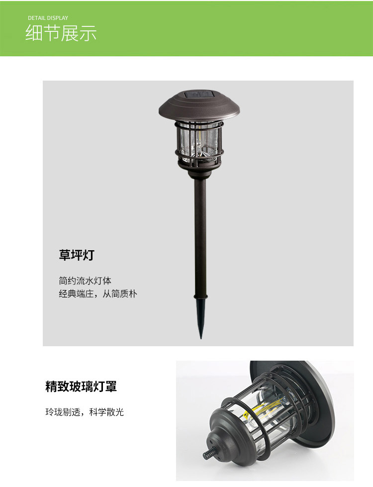 草坪灯的设计主要以外型和柔和的灯光为城市绿地景观增添安全与美丽,并且普遍具有安装方便、装饰性强等特点,可用于公园、花园别墅、广场绿化、等场所的绿化带的装饰性照明。草坪灯发展到21世纪,被广泛运用于城市慢车道、窄车道、居民小区、旅游景区、公园、广场、私家花园、庭院走廊等公共场所的道路单侧或俩册用来道路照明,提高人们夜间出行的安全性用来增加人们户外活动的时间,提高生命财产的安全。它还可以改变人们的心情,提高人的情绪,并且能够改变人的观念,创造一个明暗相间的调色板般的夜晚。白天,草坪灯可以点缀城市风景;夜晚,草坪灯具既能提供必要的照明及生活便利,增加居民安全感,又能突显城市亮点,演绎亮丽风格,以至于沿用发展为成熟的产业链。