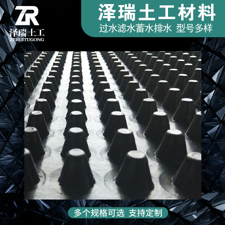 塑料排水板分卷材及片材二个系列,造型上采用将塑料板材压出封闭凸起的柱状壳体,形成凹凸状膜,现在介绍的是卷材排水板,主要应用在绿化工程:车库顶板绿化、屋顶花园,建筑工程:建筑物基础上层或下层、地下室内外墙体和底板以及顶板、屋面渗和隔热层,卷材常用规格是2m*15m,凸点高度0.8mm-5.0mm都可生产,排水板克重从500g-2000g都可定制,看设计要求与工地需求,卷材排水板铺设简单,两边都留有搭接边可焊接,可胶粘,上方可铺设土工布后进行回填,搭配使用可起到过滤,排水的作用