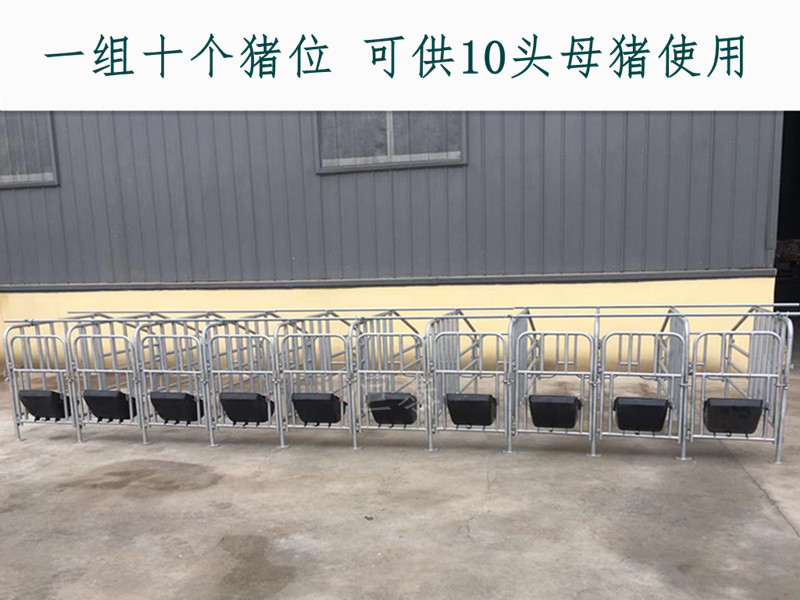 母猪定位栏大架均采用1寸镀锌管,前后门均采用6分管,定位栏上方配有母猪防跳杆 防止母猪跳窜,母猪吃料食槽,采用的钢板食槽,耐碱、耐腐蚀。