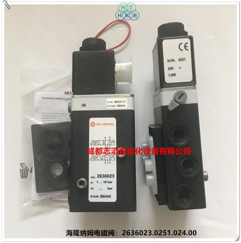 2636023.0251.024.00德国(海隆IMI HERION)纳姆电磁阀技术参数:接口尺寸1为G1/4、3和5为G1/8、2和4为法兰、功能为NC、驱动方式为电控/弹簧、阀体重量0.35kh、配海隆普通线圈0251-功率为1.6W、线圈电压为24V直流!产地为德国、先导部分为9933111!