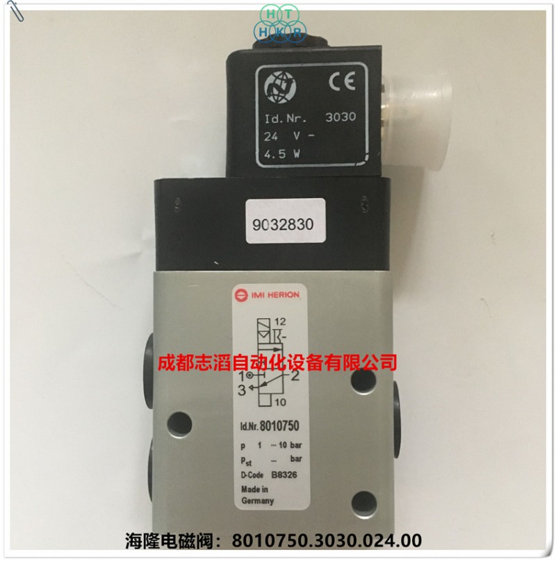 8010750.3030.024.00德国海隆IMI HERION电磁阀技术参数:接口尺寸G1/4、功能两位三通、电控气弹簧复位、通径6mm、工作压力范围1-10bar、流量1200l/min、阀体重量04kg、配海隆普通线圈3030、线圈电压为24V直流!产地为德国!