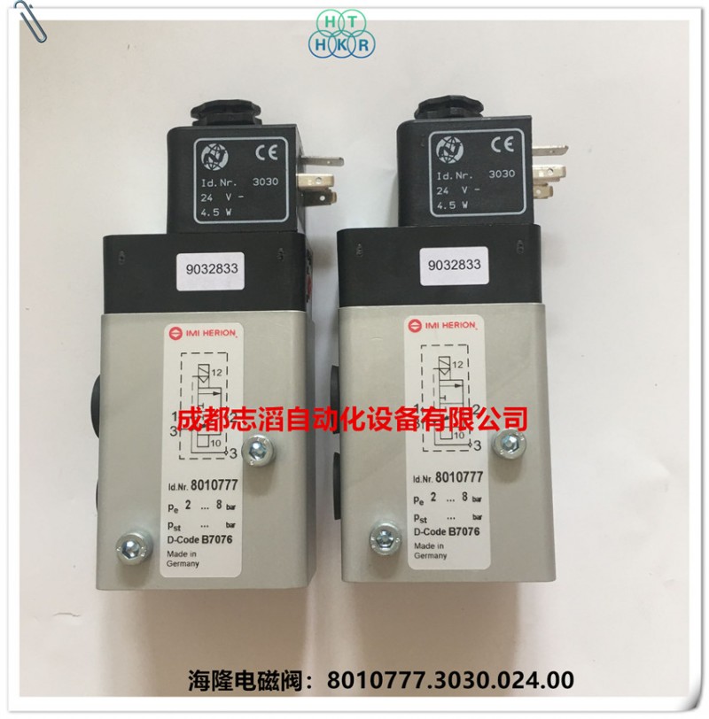 8010777.3030.024.00德国海隆(IMI HERION)电磁阀技术参数:接口尺寸1、3、5为G1/4、2和4位法兰、工作压力2-8bar、CV值为1.2阀体重量0.4kg、配海隆普通线圈3030.电压为24VDC、产地为德国或者捷克!