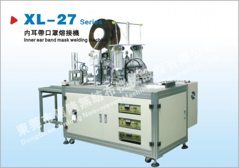 内耳口罩熔接机XL-27是自动化生产外环松紧带口罩使用机本机,本机用超音波将松紧带熔合于口罩本体两侧,在推进行包边熔接,分切,从而完成内耳带式口罩成品,僅需一名操作员将口罩本体一片片置于口罩治具上,也可以安装机械手自动放片机推进行放片,其余后续动作成品完成由机器自动操作完成