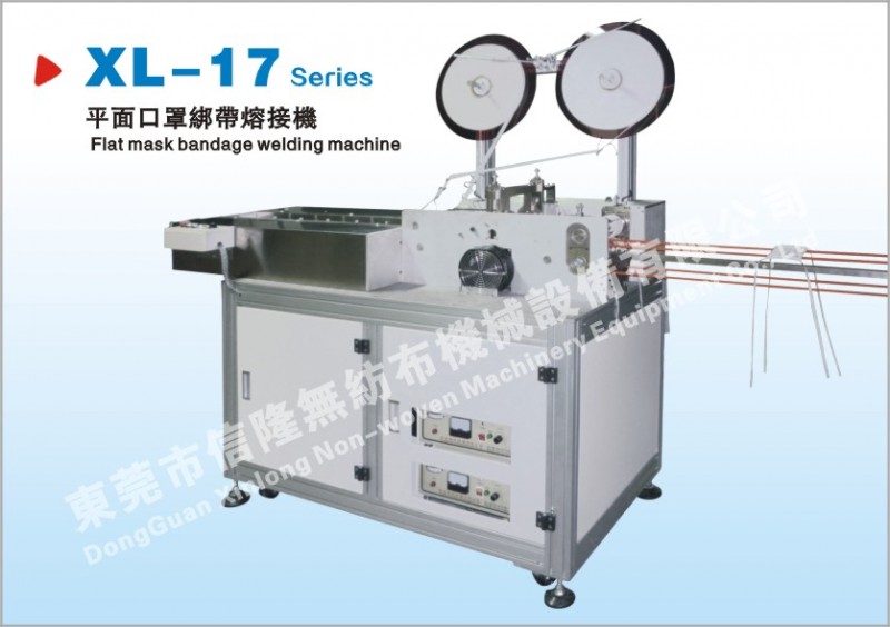 平面口罩绑带熔接机 XL-17:将绑带以超音波熔合于口罩本体机两侧,推进而完成邦带口罩成品,操作员将口罩本机一片片置于口罩治具上,其余后续动作成品完成由机器自动操作完成。 全机使用铝合金结构,坚固不生锈PLC程式控制,稳定性高性能高性能优异,口罩绑带长度可调,边带缺料可自动停机,