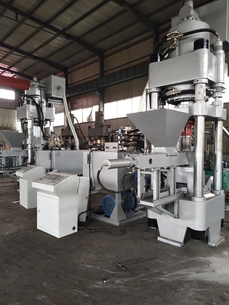 因钢屑大部分比较长,多不条状或是团状,造成无法下料,即使能下料也因比较蓬松,使其无法边续生产,故需加装钢屑粉碎设备。因钢屑材料本身流动性差,造成其送料机构的特殊性,大大区分于其它金属屑压块机的送料机构。送料机构为螺旋送料。钢屑里大部分还含有切削液,钢屑压块机还含有切削液收集装置。我公司z新研制的整条生产线轻松完成了上述问题,是切削压块机的sx产品。