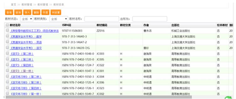实现学校对教材库存、教材计划、教材预定、教材采购等进行有效管理。用户设置好了学期课程安排,教材计划数据可以直接由该模块获取。系统投入正常运行前必须录入教材书目及现有库存情况,然后根据某学期开设课程情况形成教材需求,z终形成教材计划,根据教材计划及教材库存情况形成教材采购统计表及定单,并实现教材入库及出库操作。