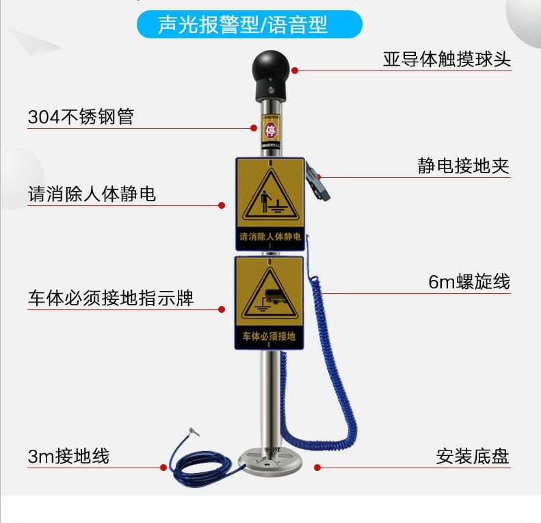 加油站人体静电释放器是我公司提供的一个值得向广大用气客户推荐的安全保护神,该产品经过高科技技术研发生产,经过广大用户试用而推出生产的。加油站人体静电释放器,当人体静电电压达到2000V(通常人体静电电压在1000V-10000V之间)时,人体与静电亚导体之间的放电能量可达0.4mJ,这远远高于油品蒸汽的z小点火能(0.2mJ),完全具备引发火灾爆炸事故的条件,加油站人体静电释放器是我公司z新研发的实用型产品,采用非金属合成半导体材料制成的半导触摸体,其释放静电缓慢,大大降低了瞬间静电能量,不会产生电击感和火花,增强了安全性。功能特点: