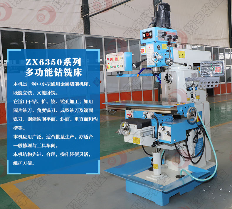 ZX6350钻铣床用于金属材料和其它材料进行钻、铣、镗、攻丝等多种切削,广泛应用于单件或成批生产的仪表工业、机械制造、建筑装饰和修配行业。