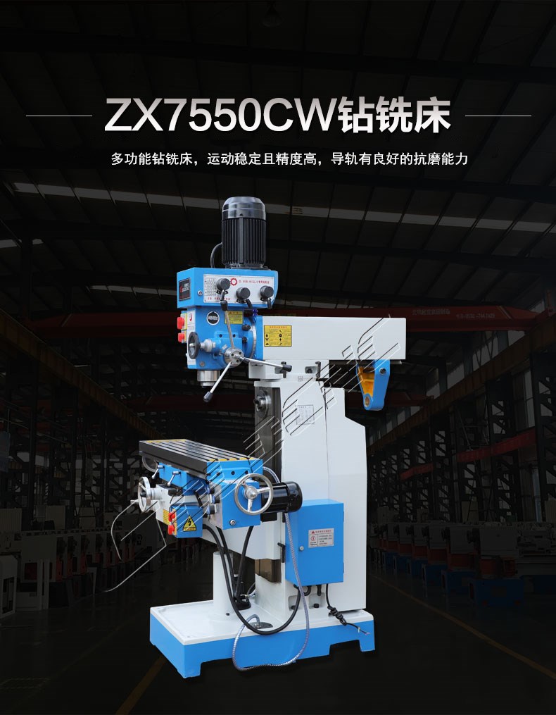 ZX7550CW为方形箱体的多功能钻铣床,立铣为齿轮传动,卧铣为皮带传动。装配机械进给器,可实现工作台纵向自动进给,且有进给刀功能,减少了劳动强度,增加了加工精度和表面粗糙度。床身导轨经淬火处理,有良好的抗磨能力。铣头安装于滑臂前端,可前后移动,不单能在垂直平面内左右回转45,又可在床身上回转360,具有良好的加工性能。