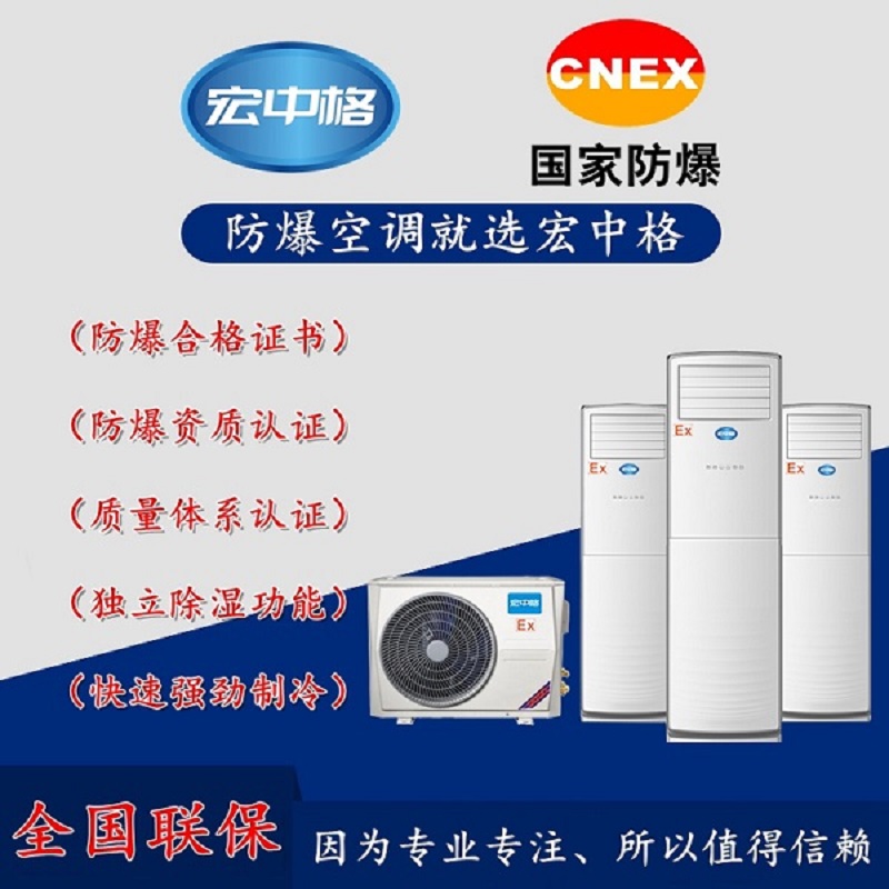 宏中格防爆供应国内各城市防爆空调是为存在或可能存在级别为IIA、IIB级,温度组别为T1-T4组可燃性气体、蒸汽与空气混合形成的易爆性气体,并有温度调节要求的场所设计的特种设备,广泛应用于:国防、石油、化工、变电站、化学品仓库、制药厂、实验室。防爆空调经国家防爆电气产品质量监督检查测试中心检测合格,取得防爆合格证书,防爆标志为ExdmeibIIBT4 。