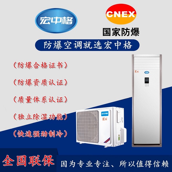 宏中格防爆空调系列机型通过特殊防爆技术加工处理,广泛应用于国防、科研、石油、化工、医药、加工制造、生物等存在ⅡA、ⅡB级,T1~T4组可燃性气体、蒸汽与空气混合形成的易引发易爆的危险场所,是针对有温度控制要求场所设计的特种调温空调设备,系列产品均通过国家防爆电气产品质量监督检测中心检验,获得国家防爆电气设备防爆合格证:防爆合格证号:CNEX17.0179;其外形美观,设计合理并具有安装维修方便等特点,全系列防爆产品内部采名牌压缩机、微电脑控制、数字显示,具有噪声低、性能稳定、操作简便等优点。深受广大特需行业客户喜爱,并以部分录入特需行业定点采购名录。