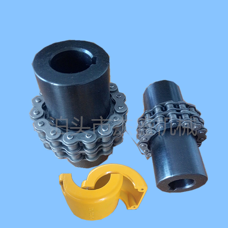 滚子链联轴器已列为 标准GB6069-85,适用于各种机械联接两同轴线的传动轴;通常用于起动频繁的高低速传动。工作温度为-40 ~+120℃;传递公称扭矩为40~25000N.m。滚子链联轴器具有结构简单,装拆容易;尺寸紧凑,工作,寿命长,适用各种工作环境,维修方便,成本低廉等特点。轴孔型式有圆柱形(Y)、圆锥形(Z)和短圆柱形(J)。轴孔和键槽的型式和尺寸按 标准GB3852-83《联轴器轴柱和键槽型式及尺寸》的规定加工。半联轴器采用 铸造,铸钢ZG35Ⅱ,轴孔和键槽采用拉制成型。链条均采用符合 标准的 产品配套。