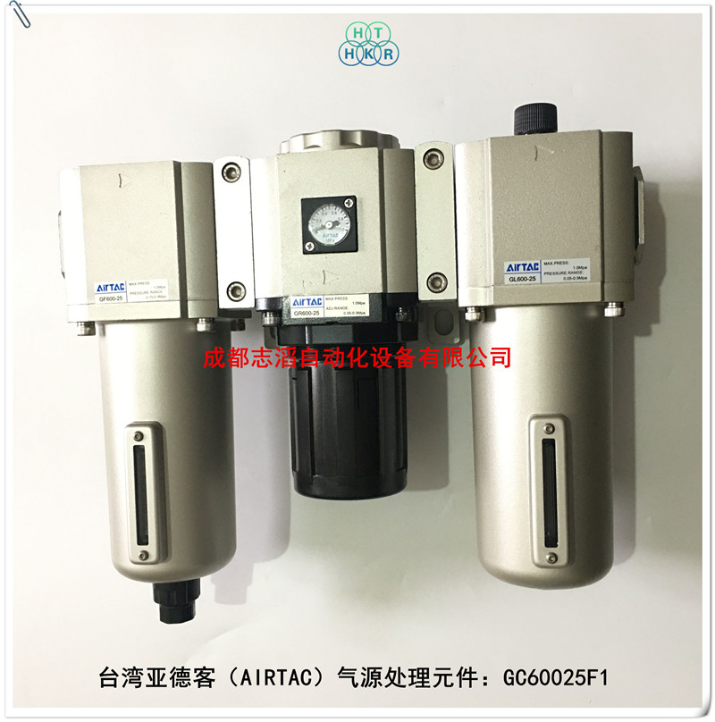 GC60025F1台湾亚德客(AIRTAC)气源处理三联件(过滤器、调压阀、给油器)技术参数说明:工作介质空气、接管口径PT1、滤芯精度40um或者5um、调压范围0.15-0.9mpa(20-130psi)、可使用压力1MPA(145psi)、保险耐压力1.5mpa(215psi)、使用温度范围-5到70摄氏度、滤水杯容积205CC、给油杯容积410CC、减压润滑用油ISOVG32或者同级油、构成元件(过滤器GF600-25,调压阀GR600-25,给油器GL600-25)、接管牙型有G牙,NPT牙可选!