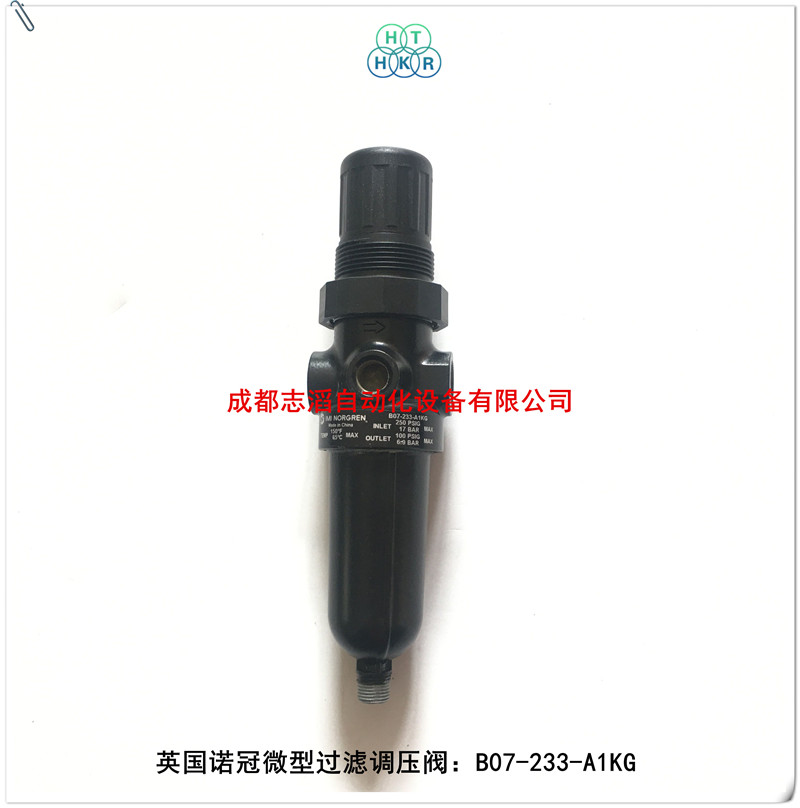B07-233-A1KG英国诺冠(IMI NORGREN)微型/管接式过滤调压阀技术参数:气口尺寸G1/4、流量6.5l/min、排放自动、滤杯金属杯、调压范围0.3-7bar、重量0.25kg、过滤精度5um、产地中国
