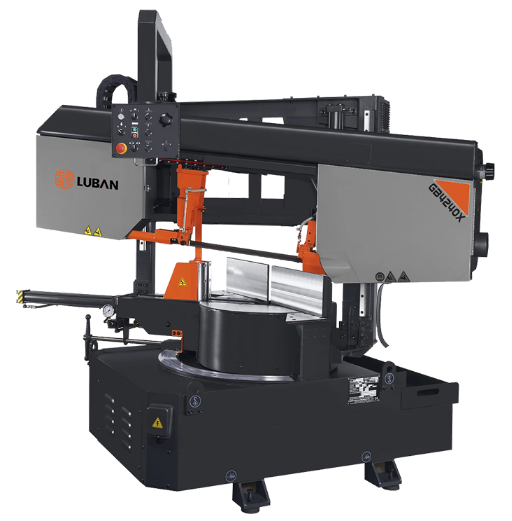 可调角带锯床用于大型钢胚,可根据用户要求自行设定任意旋转角度,旋转角度顺时针方向0~45°。亦在选取适当的工艺参数后,切割各种黑色或有色金属材料。