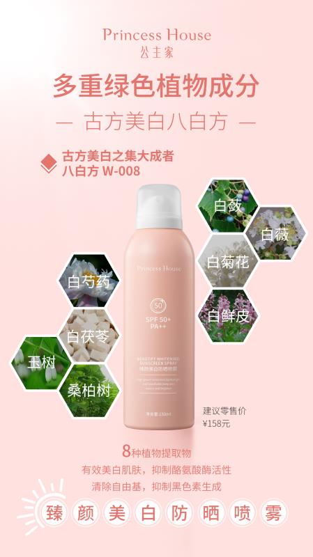 公主家臻颜美白防晒喷雾也是SPF50+ PA+++高倍防晒,这款公主家防晒喷雾,喷雾轻柔细腻,z小可达纳米级,清透水润,而且喷雾中添加了白芍药、白茯苓、玉树、桑柏树、白蔹、白薇、白菊花、白鲜皮等8中植物提取物,有效美白肌肤,抑制酪氨酸酶活性,清除自由基,抑制黑色素生长。