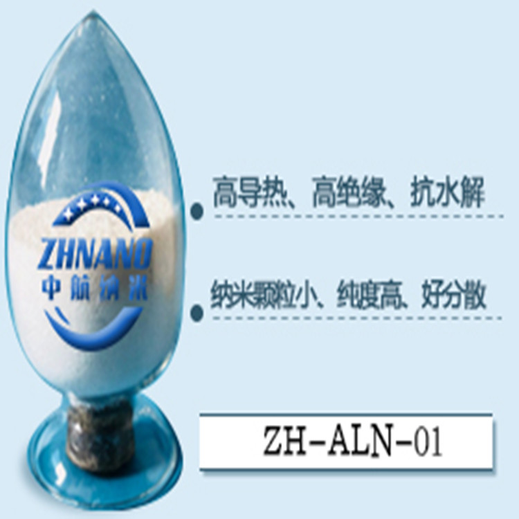 纳米氮化铝(AlN)通过气溶胶烧蚀法制备,纯度高,粒径小,比表面积大,表面活性高,通过表面改性处理的粉体,不会发生水解反应,含氧量极低(<0.01%),绝缘导热性能效果非常明显。用在高分子树脂中,增黏不明显,是目前好的高导热绝缘填料。纳米氮化铝属类金刚石氮化物,可稳定到2200℃,室温强度高,且强度随温度的升高下降较慢;纳米氮化铝粉体具有良好的导热性,热膨胀系数小,热导率理论值为340w/mk,与铜差不多,同时又高度绝缘,电阻率1015,且可耐1400度高温,可以大幅度提高塑料和硅橡胶的导热率,是良好的耐热冲击材料,抗熔融金属侵蚀的能力强,是熔铸纯铁、铝或铝合金理想的坩埚材料;纳米氮化铝具有优良的电绝缘性,介电性能良好;纳米氮化铝具有良好的注射成形性能;用于复合材料,与半导体硅匹配性好,界面相容性好,可提高复合材料的机械性能和导热介电性能。