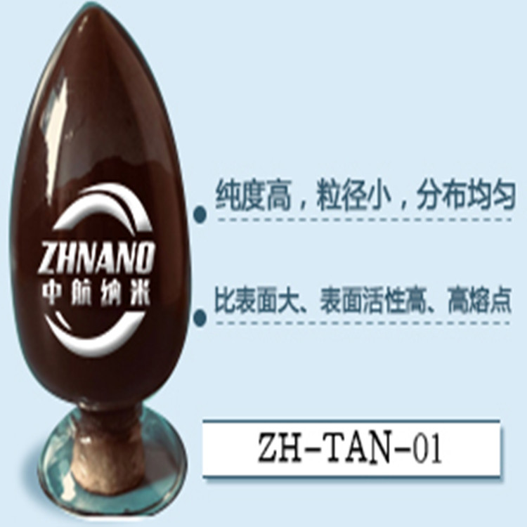 纳米氮化钽(TaN)通过气溶胶烧蚀法制备,具有纯度高,粒径小,分布均匀、比表面积大,高表面活性,不溶于水、酸,微溶于王水,溶于氢氧化钾并分解释放出氨。加热至2000℃即释放出氮气。用来制造高端片状电阻的材料,氮化钽电阻则可抵抗水汽的侵蚀。用作超硬质材料添加剂,用于喷涂,增加变压器、集成线路、二极管的电稳定性。