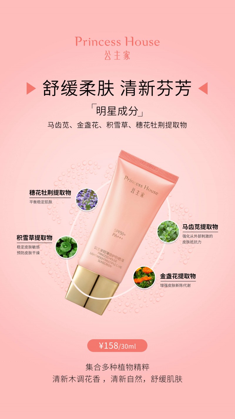 公主家轻薄倍护防晒霜,硬核级防晒指数,为你的肌肤撑起“保护伞”。特别添加沙棘果等提取物,保湿水润,舒缓养肤,敏感痘肌也可放心使用。质地轻薄不油腻,轻松隔离恼人紫外线,让你自在享受防晒体验。