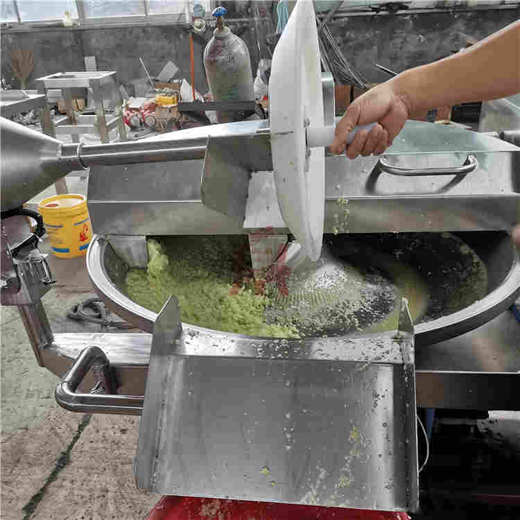 斩拌机说明:斩拌机对原料进行斩切,搅拌和乳化,防止原料肉中肌红蛋白,脂肪及其他营养成分被氧化,破坏,从而保留了原有的色香、味及各种营养成分。通过斩切提高了产品的细密及和水的亲和力,使产品的弹性得到提高,该机具有刀轴转速高,功率大,斩切乳化效果好,处理原料范围广等特点。不仅可斩化,乳化各种肉类,也可斩切,乳化肉皮,筋腱等粗纤维和复合胶原蛋白的原料。