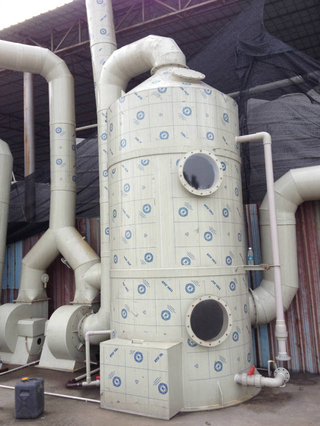 水喷淋净化塔结构简单,主要由主体,进气管,排气管,喷头,水源(水池)和水浴循环系统组成。