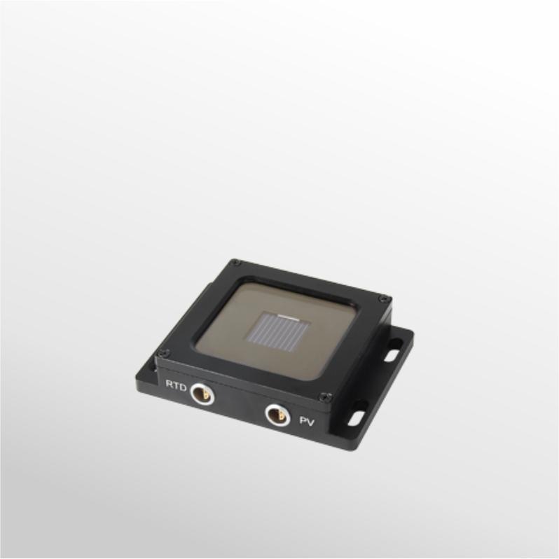 标准太阳电池为2cm*2cm 的单晶硅或多晶硅(可依据用户需要定制)光伏电池,经过老化、筛选,选择稳定性好、表面均匀的进行全密封式封装。太阳电池置于方形铝基座的中心,并配有一个抗辐照玻璃保护窗口,窗口的封装采用透明性好,折射系数相近的光敏胶。太阳电池的下面装有Pt100铂电阻温度传感器,在封装前已进行标定。太阳电池和测温传感器均采用四端输出的Kelvin连接接线方式。