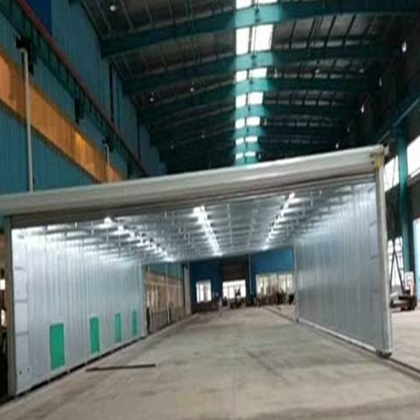 整体移动式喷漆房主要应用于大型工件的打磨或喷漆工作中,方便收集工作中产生的粉尘或废气。在一般情况下每套房体设设置有2-3个排风净化工位,哪个工位上的工件需要喷漆时,房体则行走移动到那个工位,其他工位可以继续打磨工作,待房体内的工件喷漆完毕后,再控制移动房体行走到打磨完毕的工件工位,如此设计可以实现大型工件的不间断连续喷漆工作。房体为钢结构构造,房体立柱下面设置有两台电动驱动行走机构,行走机构沿地面轨道行走。移动房体两端设置有电动卷帘大门,房体行走时,大门升起,待到达指定位置时,大门降落关闭。大门与行走机构由电气控制部分连锁控制,大门完全升起后,房体才可移动行走。