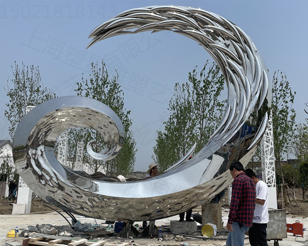 月亮不锈钢镜面雕塑|圆环雕塑制作流程:设计图纸→3D模型→骨架→板材锻造→修整→焊接成型→环氧底漆→氟碳面漆→分节运输→工地安装。