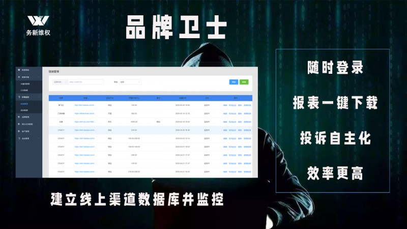 杭州务新网络科技有限公司是一家旨在专注于互联网品牌保护的公司,品牌卫士是杭州务新网络科技有限公司旗下产品,品牌卫士利用互联网尖端SAAS技术自主研发一套大数据分析和24小时检索监a控系统, 用大数据为品牌方提供线上知识产权维护+分销渠道管理+线下打假+公正存证机构战略合作+多律师战略合作五维一体全方位”品牌无忧”整合维权服务。 核心人员来自阿里或者在维权行业积累有多年经验。多年来已经服务过上千品牌。 公司拥有服务部、法务部、销售部、技术部、市场部、运营部、客满中心部、综合部八大部门, 并与全国多家知名律师事务所、线下打假机构、线下调查机构、商标代理机构、司法鉴定中心、 公证处及其他知名电商服务公司都有深度战略合作,并依托多年电商行业经验和lx的尖端技术研发能力, 力图在维权领域做得更专业、更权威。