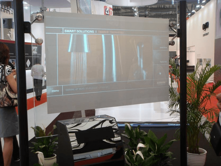 全息投影幕,又叫全息背投幕、透明背投幕,是采用了全息技术的新一代创新型背投屏幕,能提供空中动态显示,透明的显示效果允许观看者可以观看屏幕上图象的同时还可以看穿屏幕,外观看起来就像一块透明玻璃,及具创新性。单片穿透式屏幕,内部具有精密的光学结构。具备高透光性、高亮度、高对比度的特点。具有同时呈现实景与影像的功能,这种全新的互动展示技术将装饰性和实用性融为一体,是一款时尚的展示工具。