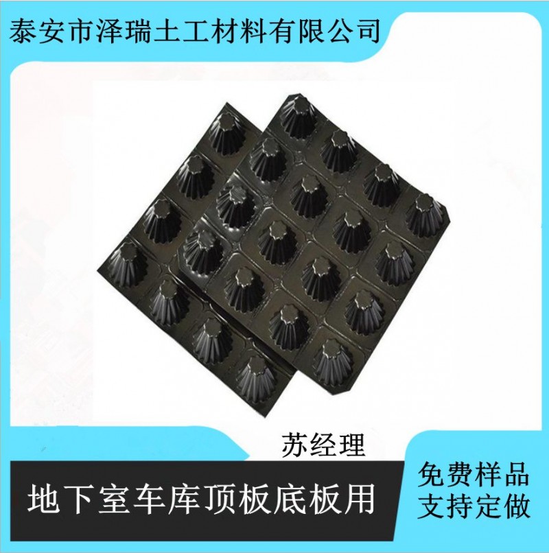 泽瑞排水板凸点高度有:0.8公分、1.0公分、1.2公分、1.5公分、1.6公分、1.8公分、2公分、2.5公分、3公分、4公分、5公分--具体型号确定根据图纸或者工程施工需求来定。
