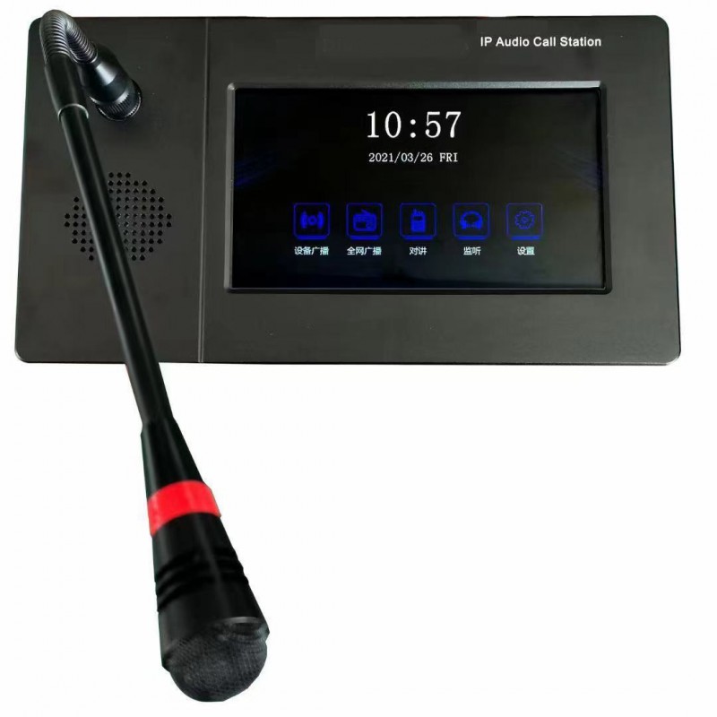 本网路寻呼话筒可以通过麦克风或者本地线路输入对终端进行一对一单播、一对多组播和全区广播,也可以和系统中支持对讲的终端进行双向的通话。本网络寻呼话筒配置7英寸触摸屏,可以进行系统设置,也可以将终端的IP录入到地址簿中,可以通过地址簿选择操作终端。
