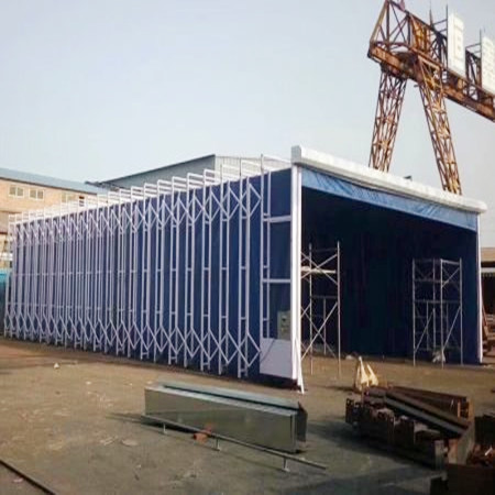 伸缩移动前室整体为钢制框架结构,可前后伸缩移动。框架之间的滑动连接机构框架在驱动装置的带动下沿地面的轨道前后竖直平行移动,同时带动蓬布展开合拢。移动前室收缩合拢时,将工件移入工作区,展开时可进行工件的喷漆或打磨工作。在不喷漆的工作时间内,可将前室合拢,腾出空间场地作为其他与喷漆交叉作业的工序使用。