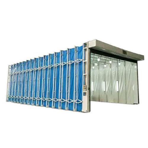 伸缩移动前室整体为钢制框架结构,可前后伸缩移动。框架之间的滑动连接机构框架在驱动装置的带动下沿地面的轨道前后竖直平行移动,同时带动蓬布展开合拢。移动前室收缩合拢时,将工件移入工作区,展开时可进行工件的喷漆或打磨工作。在不喷漆的工作时间内,可将前室合拢,腾出空间场地作为其他与喷漆交叉作业的工序使用。