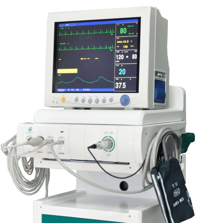 2、显示内容:用户信息、心电波形、呼吸波形、脉搏波形、心率、血压、呼吸率、经皮氧分压、脉率、体温、电量、导联、报警提示、时钟等;