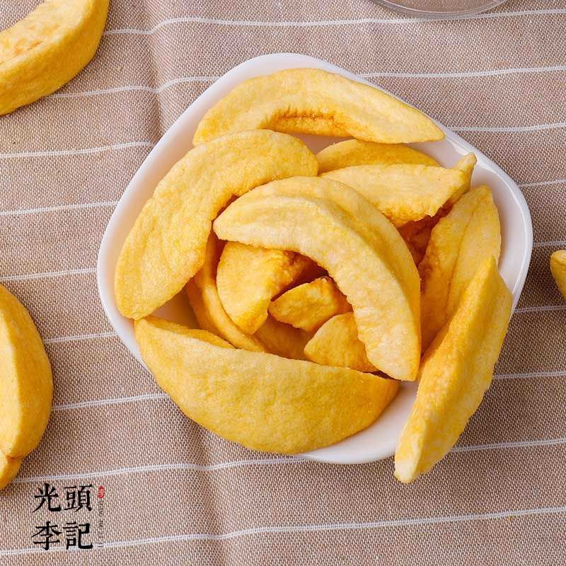 新鲜黄桃,采用VF工艺制成果蔬脆,锁住新鲜,锁住美味,使黄桃脆保持原有的色、香、味、形,原滋原味,酥脆爽口,果香四溢,齿颊留香。