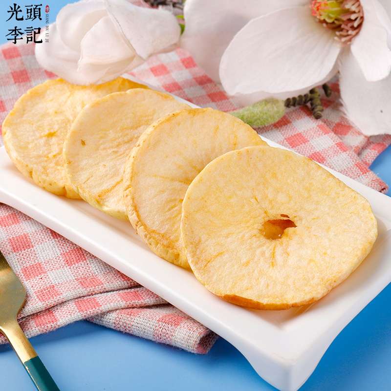 新鲜苹果,制作成苹果脆保存了新鲜苹果天然的色泽、形态和风味,高颜值,香脆爽口。