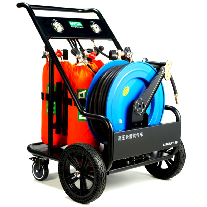 移动式供气装置属于高压送风式长管呼吸器,是一种便捷的外供气式呼吸保护装备,整套装置由车架总成、气瓶销售单元、供气管、Y型三通接头、长管呼吸器五个独立的产品,通过自行有机组合,实现可供呼吸保护的外供气式装备,它是以气瓶的压缩空气为气源,通过车架总成上的集气减压装置,经供气管提供到呼吸器的面罩中,供作业人员呼吸,起到有效保护作业者的呼吸系统。