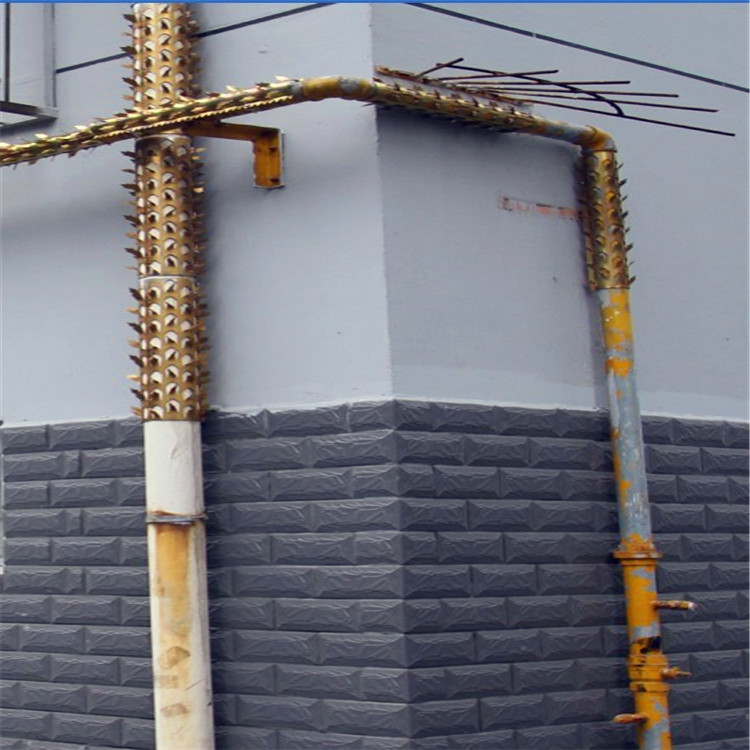 针对这一现象,我公司的管道防盜刺,它可以安裝在一楼、二楼之間的外墙下水管道或煤气管道、围墙上,小偷根本不能绕过防盜刺往上爬,小区裝上防盜刺,这样就杜绝了小偷作案的可能。