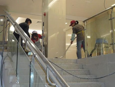 使用2千瓦真空吸尘器,吸拭尘迹,配合牵尘液将所有易附 灰尘的材料,用品,家具表面擦拭,然后对其进行专业养护,洁瓷净,不锈钢光亮 剂,擦钢膏,铁艺水及清洁蜡的使用.就是对其材料镀上保护膜使其光可照人,更 易清洁。