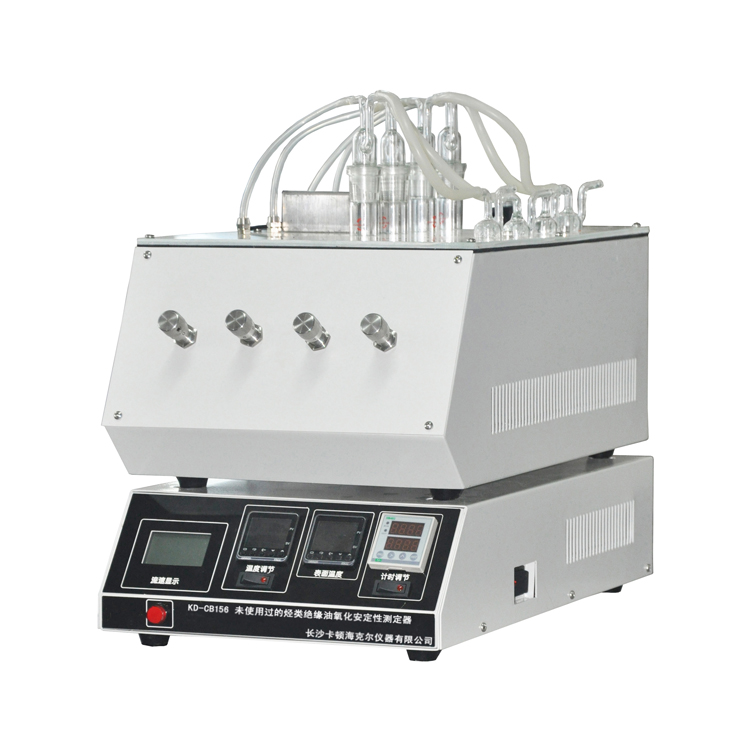 未使用过的烃类绝缘油氧化安定性测定器适用于检测未使用过的烃类绝缘油在加速氧化的条件下氧化性能。试验原理是:将样品中放入固体铜催化剂,恒速通入空气,在特定的温度下保持一定的时间后,通过测定氧化后油品的挥发性酸值、油溶性酸值和沉淀物含量来评价抗氧化能力。