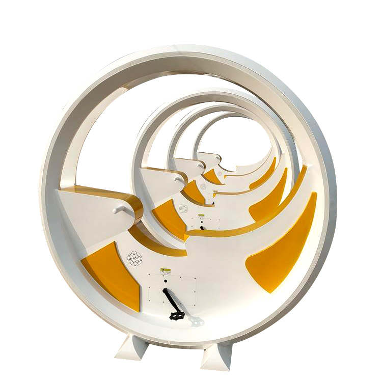 自行车喷泉加入了智能控制系统,通过脚踏的方式运行来控制喷泉水柱的高低,来展现水柱的高度和形态变化等,自行车喷泉结合了传统自行车元素以及人体工程学原理,通过双脚踩踏实现喷泉功能达到水景效果,是一款新型的无动力景观游乐设施。